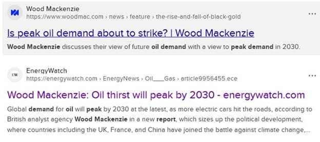 Energy consultant Wood Mackenzie, which has been covering the oil industry since 1973, has been a leading promoter of peak oil, gas, and coal, driven by its belief that the public’s embrace of a decarbonized world means an early end to fossil fuel consumption growth. The firm has been discussing such a scenario for years. The following graphic from a recent Google search about Wood Mackenzie and peak oil shows the second and third articles listed. These articles reflect the consultant’s views from its research in 2018 and 2019. But their view hadn’t changed until recently.