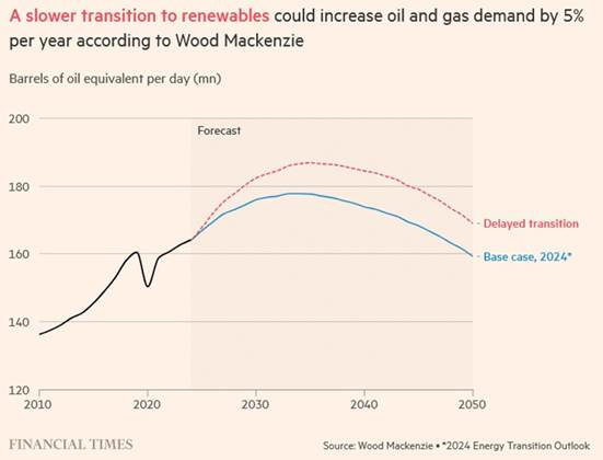 A chart reportedly taken from Wood Mackenzie’s 2024 outlook shows a sharply different view from the earlier projection. The chart was presented in the Financial Times article, but the scale is wrong. The world is not consuming 165 mmb/d of oil currently. The historic pattern of consumption shown is accurate, so we assume the scale is only mislabeled. However, the FT’s use of the chart is to show the red dotted line showing that the delay in the energy transition means oil demand will be about 5% more per year, making its future peak roughly 113 mmb/d, declining to 97 mmb/d in 2050. Importantly, there is almost no decline in oil use 25 years from now compared to now.