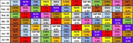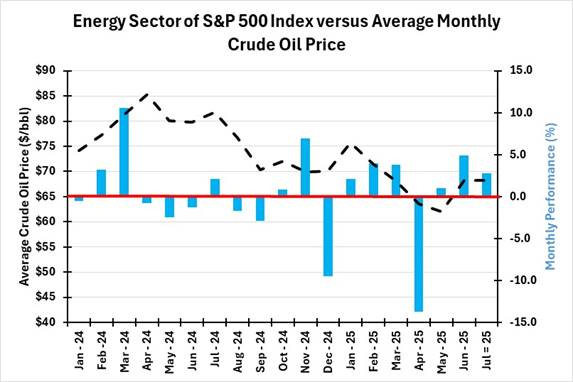 Energy’s performance in July was helped by oil prices that surprisingly averaged almost precisely the same as in June. The chart of average monthly oil prices compared to the energy sector’s performance shows a surprisingly positive stock market performance early in the year, despite oil prices declining consistently. Oil prices declined every month for the first five months of 2025, falling from $75 to $62 per barrel. The rebound in oil prices from the May low to $68 for both June and July explains the better performance of energy.