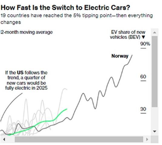 Remember when BloombergNEF declared that the U.S. had joined Europe and China in surpassing the tipping point of 5% of new car sales being electric vehicles? That was in 2022. BloombergNEF said that if the U.S. followed the other 18 countries that had surpassed a 5% share, EVs would account for 25% or more of new U.S. car sales by 2025. Even with the pulling forward of sales into 3Q2025, the U.S. EV share didn’t even reach half of BloombergNEF’s projection.