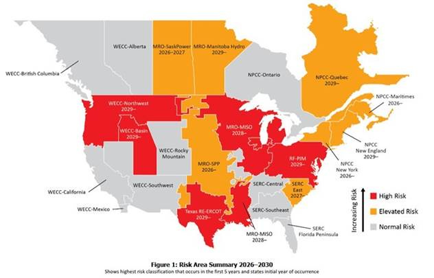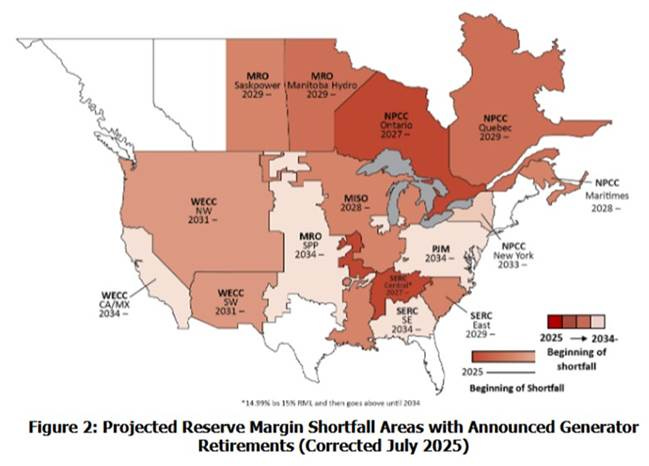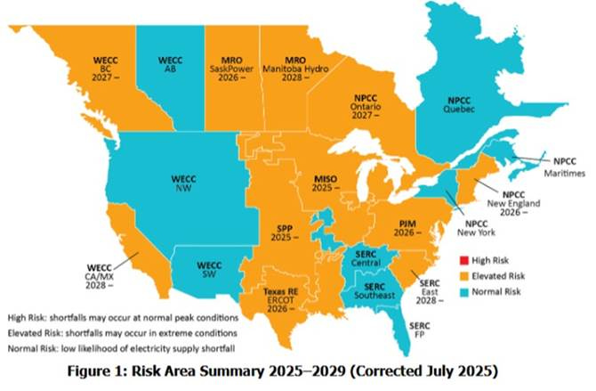 NERC has released its 2025 Long-Term Reliability Assessment. The highlight was a map with four major regional grids that may experience immediate or medium-term supply shortfalls.