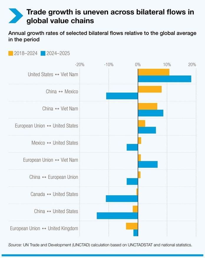 One of UNCTAD’s key points was that shifting trade patterns, driven by increased supply chain risk management, have changed certain trade relationships over the past two years. Company management is moving away from cost-driven supply chains toward risk-minimized ones.