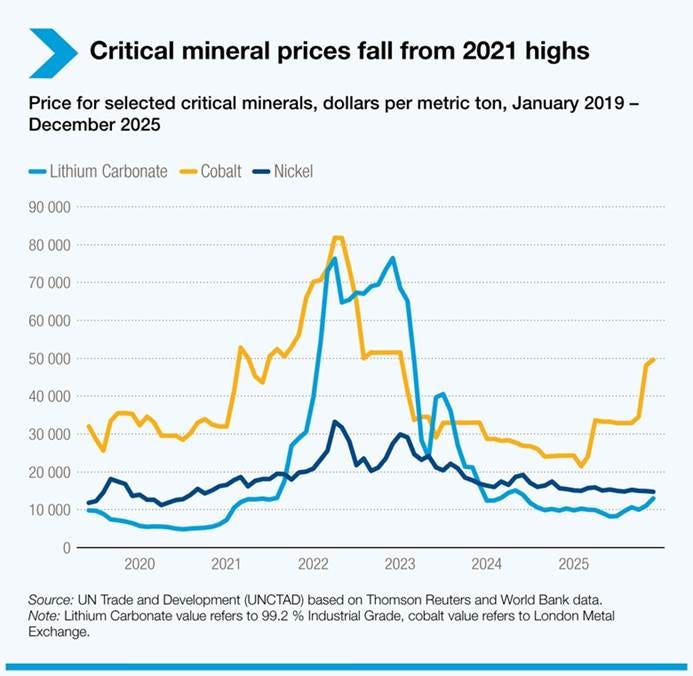 Critical minerals have become a focal point of government policies. UNCTAD focused on how certain critical minerals have experienced price declines, except for cobalt. Focusing on only these three minerals is short-sighted, as numerous other critical minerals have experienced price rises similar to that of cobalt. The chart shows that the COVID economic shutdown and subsequent rebound drove these critical mineral prices up, only for them to correct once supply growth resumed.
