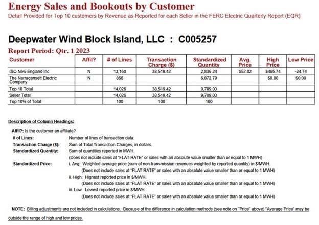 Another offshore wind data issue we are investigating is the sudden absence of generation data on the FERC site for Deepwater Block Island Wind, LLC (BIW). This is the 30-megawatt, five-turbine wind farm located off the coast of Block Island, in Rhode Island state waters. It was the first operating offshore wind farm in U.S. waters. Retrieving quarterly data from the FERC website is a tedious process. We have records of data produced by BIW from when it began reporting power data in 2017 to the first quarter of 2023, based on spot-checking interim quarterly data. Since the report shown below, we have found no reported data. Why?