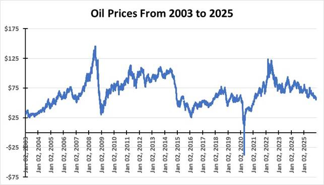 The following table shows the annual sector performance for 2003-2025. While the chart is visually challenging, we suggest that readers focus only on the green squares. They show the energy sector’s ranking each year, from highest to lowest. Energy’s annual rankings are not surprising when one examines the following chart of oil prices for the 2003-2025 period. Oil prices influence the earnings of producers and oilfield service companies, and higher profits and shareholder cash and stock price returns drive share prices.