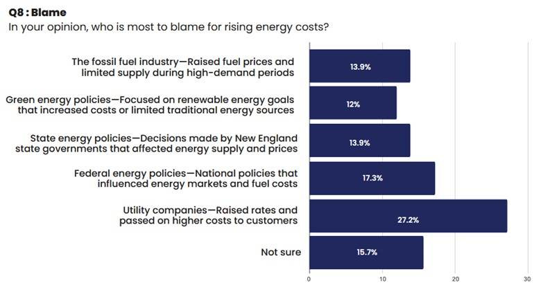 This lack of knowledge about green energy strategies contributes to the respondents’ views of who is to blame for high utility bills. Of the New England women surveyed, 53% said they were misled about the cost of the renewable energy transition. To some degree, this view explains Governor McKee’s effort to cut utility costs ahead of the upcoming election as he moves to avoid a potential political backlash.