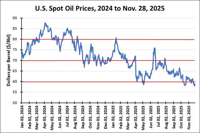 A Reuters poll of Wall Street analysts and economists sees the WTI oil price averaging $59 a barrel in 2026, down from $60.23 in the October poll. Analysts are predicting Brent oil prices to average $62.23, down from the $63.15 a barrel forecast in the Reuters October poll. One needs to consider what happens with a sub-$60 oil price.