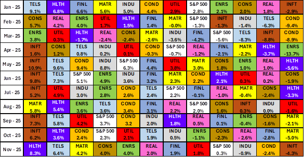 Amazingly, only three sectors posted losses for November. The Industrials sector declined 0.85%, and Consumer Discretionary fell 2.39%. What weighed on the index’s performance in November was the Information Technology sector’s 4.29% decline.