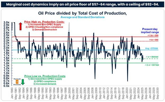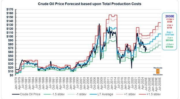 Again, The Crude Chronicles utilized the oil price-to-total production cost ratio to develop an oil price forecast. It is pictured in the chart below. We are not endorsing the price forecast, but merely presenting it to show that if future trends follow historical patterns, oil prices are likely to rise rather than fall significantly.
