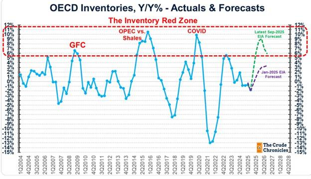 As can be seen, at the start of 2025, the EIA predicted that oil inventories in OECD countries (the Western developed economies) would rise at a rate of 3% this winter. Now it shows a rate of increase of 9%. Such a high rate has not been experienced since the 2020 COVID and 2015 OPEC vs. Shales battle. Both events led to sharp drops in oil prices, including a brief plunge into negative territory in 2020.