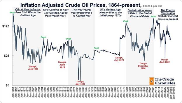 A chart from The Crude Chronicles, tracking inflation-adjusted oil prices since the Civil War (when the U.S. oil industry began), shows six distinct industry cycles. In the industry’s infancy, prices were high and volatile. That was because demand was primarily for lighting and medicine, limited markets. Pricing was volatile because the industry was regional. The discovery of additional fields and the rise of Standard Oil led to lower oil prices and greater price stability, which was facilitated by the development of a national market.