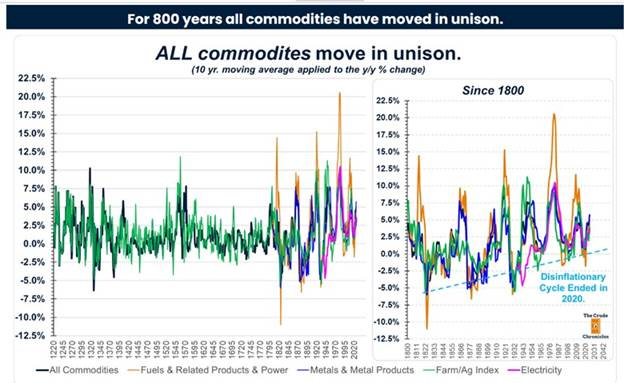 In analyzing the oil industry cycles, The Crude Chronicles presented an interesting chart showing that commodities have moved in tandem for centuries. To mitigate the volatility commonly experienced by commodities due to economic and natural events, the chart utilizes a 10-year moving average for the year-over-year percentage changes. This smoothing still allows the long-term trends in commodity markets to emerge.