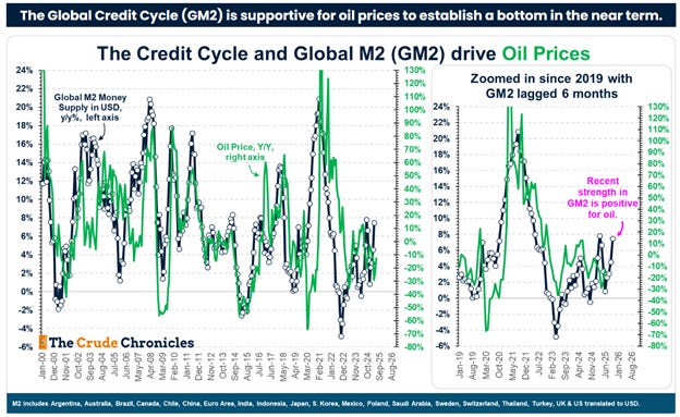 Finally, to further understand another factor, besides oil supply and demand, that influences oil prices, we should consider the economy’s position within the credit cycle. The Crude Chronicles compiled the following chart, which illustrates the long history of changes in global money supply in relation to changes in oil prices. The right-hand side shows the chart from 2019 to now, with the change in money supply lagged by six months. In other words, it takes six months for expansions or contractions in money supply to impact economic activity, oil demand, and oil prices. Most major economies are easing their monetary policies, which means more M2 is available and is likely to increase in the foreseeable future. Therefore, current conditions suggest that oil prices are likely to rise in the foreseeable future.