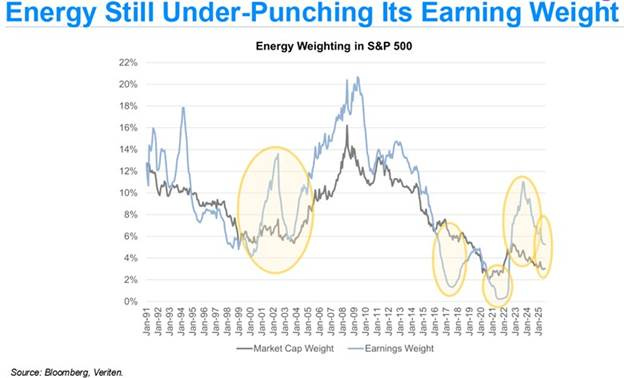 The other chart Murti emphasized was that the relationship between the market weighting within the Standard & Poor’s 500 Index and the earnings weight was out of alignment. He highlighted numerous times when the relationship diverged. In each case, the relationships were reestablished. That does not mean that the earnings contribution will not return to the market weight. However, if the cycle is on the verge of an upturn in profitability, the market weight will likely rise to meet the earnings weight.