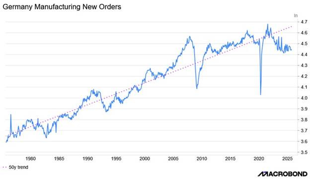 Germany’s economy has seen its manufacturing new orders fall for five years. The decline follows a decade of relatively stagnant flow of new orders. Unfortunately, we cannot redraw the 50-year trend line. However, suppose you examine the trend from 1975 to 2008, at the onset of the Great Financial Crisis, and visually extend the line to 2025. In that case, you see a significant gap between the expected new manufacturing orders and the experience. This is a reflection of the damage Germany’s energy policies have had on its economy.