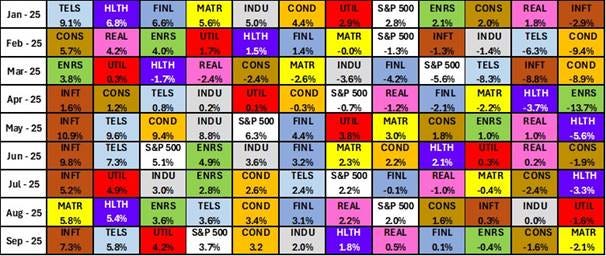The heady days of June to August for Energy came to a crashing end in September. The sector posted a negative 0.4% result for the month, sending it from the top third of the sector rankings to a ninth-place finish.