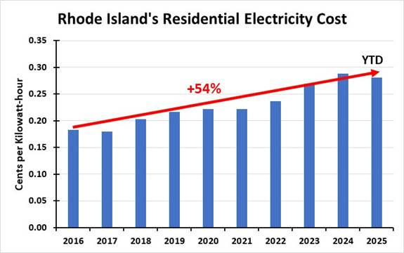 Since 2016, Rhode Island’s electricity costs have increased by 54%. Although our chart indicates that the 2025 rate is down from the 2024 rate, we only have the year-to-date figures for 2025. We know that the remaining three months will be more expensive for energy than the past six summer months, as they are the costliest winter energy months, and Rhode Island Energy has announced its monthly winter rate. The energy cost will be $0.1477/kWh, which is lower than the $0.16387/kWh cost in last year’s comparable months and the first three months of 2025. This reduction, along with lower summer months compared to 2024, reflects the low price for natural gas contracted by Rhode Island Energy. The state requires utilities to purchase six months of fuel supplies, which establishes the monthly cost. The utility is not allowed to profit from its fuel charge.